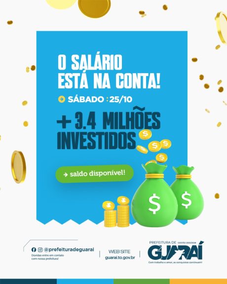 Na manhã desta sexta-feira (24), a Prefeitura de Guaraí anunciou a antecipação do pagamento dos servidores municipais referente ao mês de outubro para sábado, dia 25. A medida reafirma o compromisso da gestão da prefeita Fátima Coelho e do vice-prefeito Gleydson Bueno com a valorização do servidor público e o reconhecimento do papel essencial de… Continue lendo Prefeitura de Guaraí antecipa pagamento dos servidores para sábado (25)